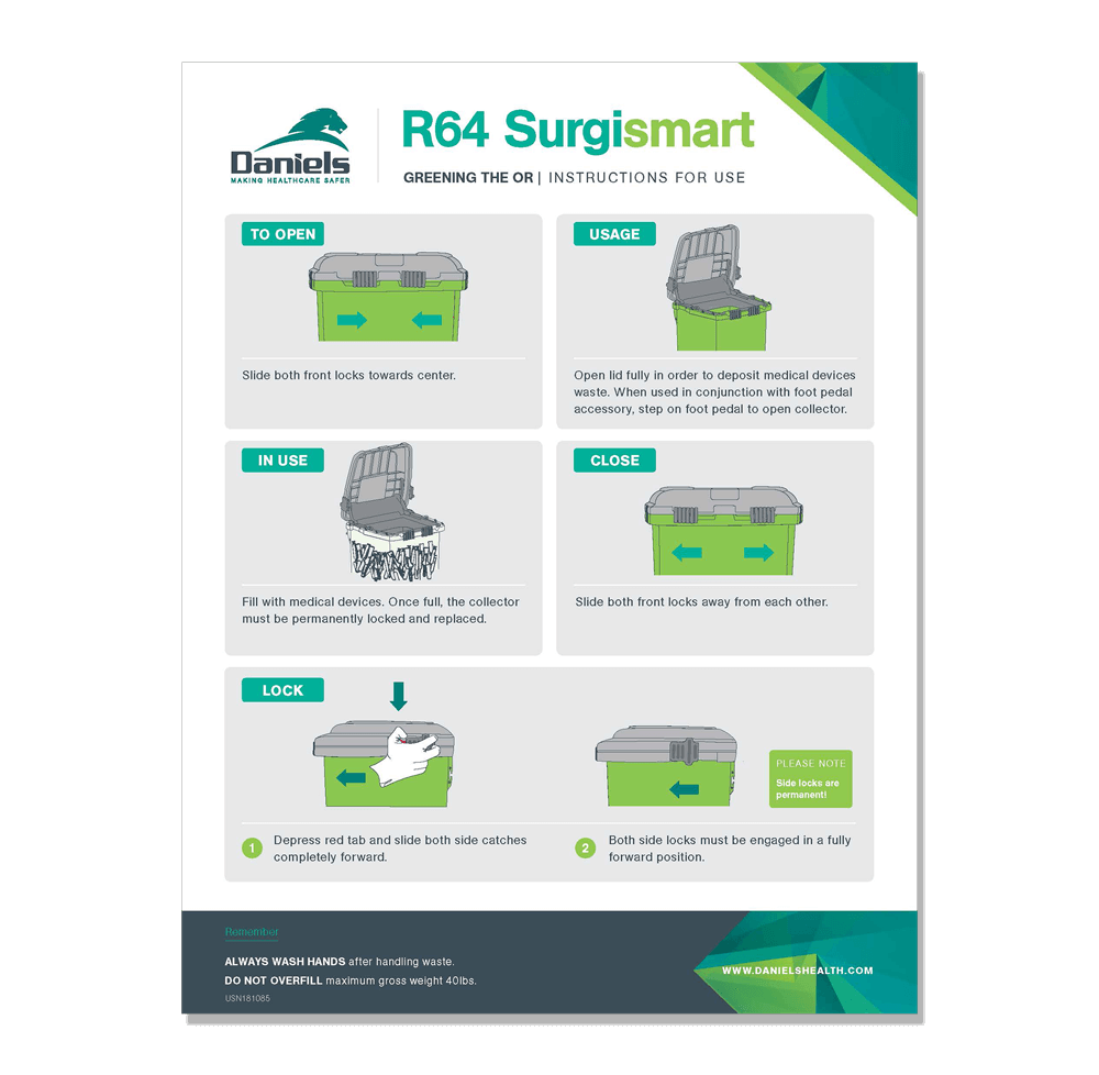 As an industry leader in healthcare safety and sustainability, Daniels’ latest offering is a proud reflection of our underscoring values. Achieving a significant increase in OR waste segregation, minimized footprint, and reduced waste spend – Surgismart presents the latest innovation in sharps disposal. Designed with a full access opening for the disposal of large and bulky sharps or surgical instruments, and fitted with secure safety locks and foot pedal capability for hands-free access, Surgismart insures safety is paramount in the deposition of sharps in the OR.