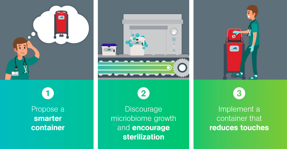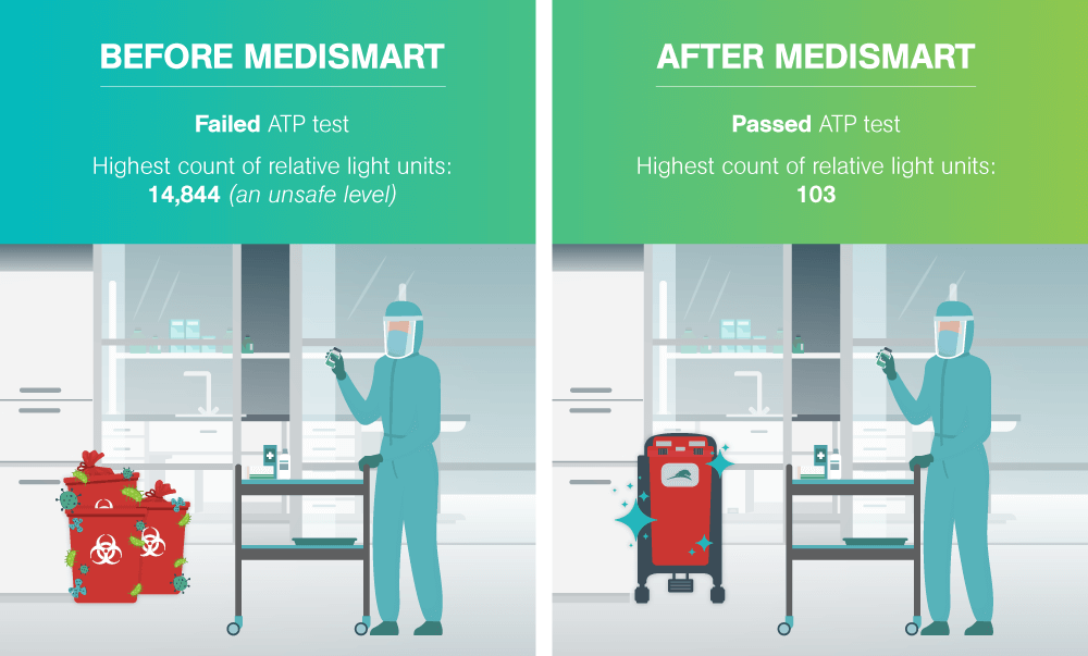 The second assessment round prompted the testing of the reusable medical waste containers in the room. The results revealed extremely high microbial counts on the surface of the containers. The microbial count was determined through an ATP test, the process of rapidly measuring actively growing microorganisms through detection of adenosine triphosphate (ATP). The goal of an ATP test in this scenario was to reduce the ATP count to a target-level of <250 relative light units; the test failed with the average of the highest count being 14,844 – exceeding safe levels.