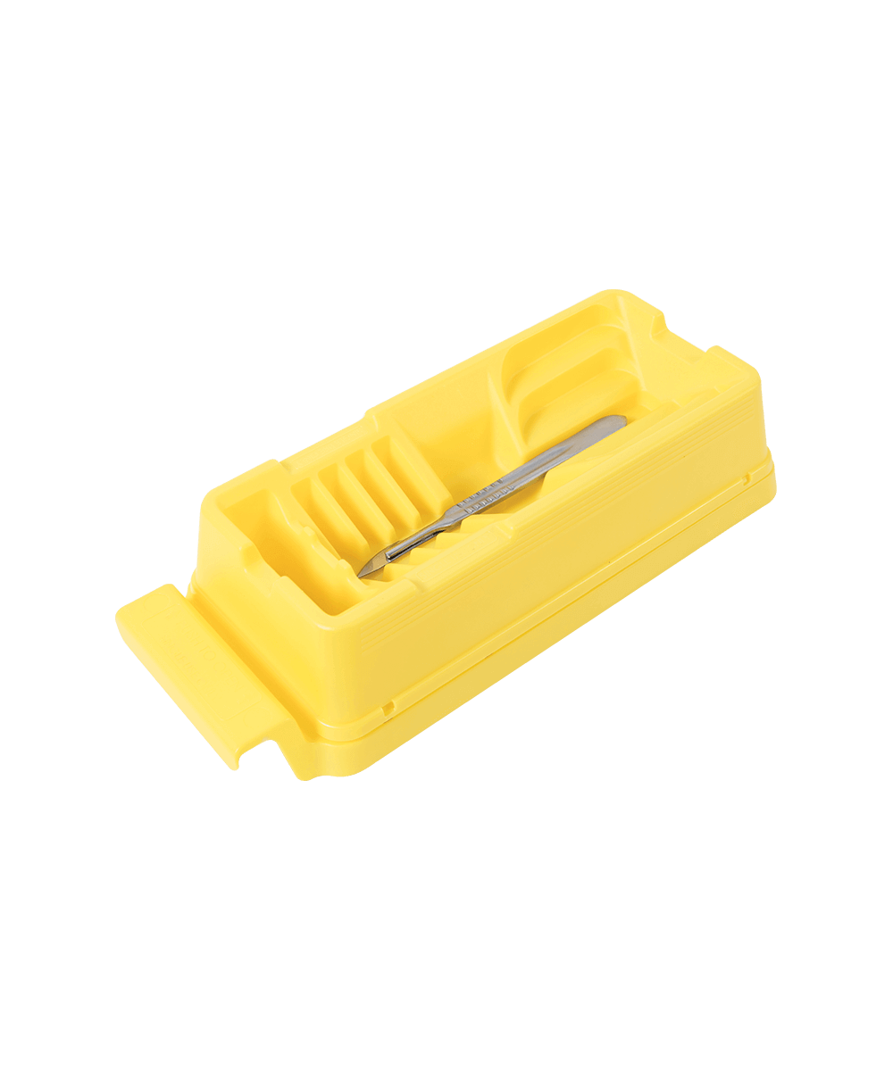 Designed to reduced the incidence of sharps injuries from hand-passing of sharps in operating theatres. Combines the Bladesafe transfer tray with a multi-functional ‘base tray’ – the Counting Tray. The Counting Tray features a counting area for suture needles with numbered foam strips, three scalpel removers, a magnetic pad for safely holding scalpels and two scalpel trenches. At the end of a procedure, the Bladesafe can be clipped onto the counting tray, housing any sharps, and safely disposed of as one.