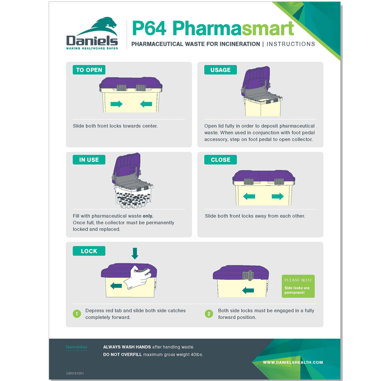 A standard operating procedure for the Daniels P64 Pharmasmart pharmaceutical waste container; this step-by-step instruction assists users in the correct opening and secure locking of the pharmaceutical waste container.
