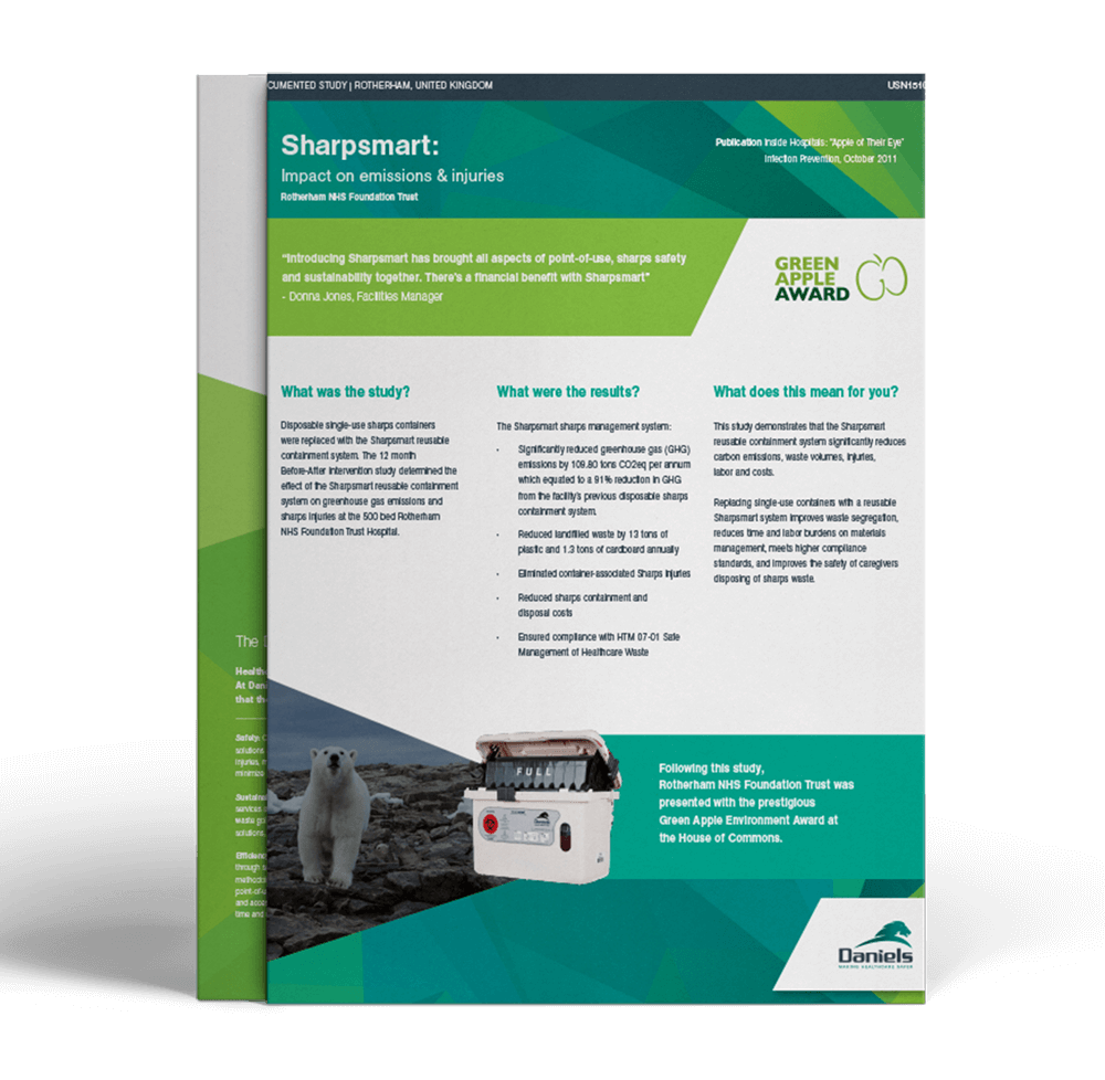 This published study used a lifecycle inventory and a life cycle analysis tool to examine the impact on greenhouse gas emissions generated from the supply chain for goods and services, when the hospital replaced disposable sharps containers with Daniels Sharpsmart reusable sharps containers. Results in this study summary show the significant reduction in CO2 emissions as a result of the reusable Sharpsmart sharps container