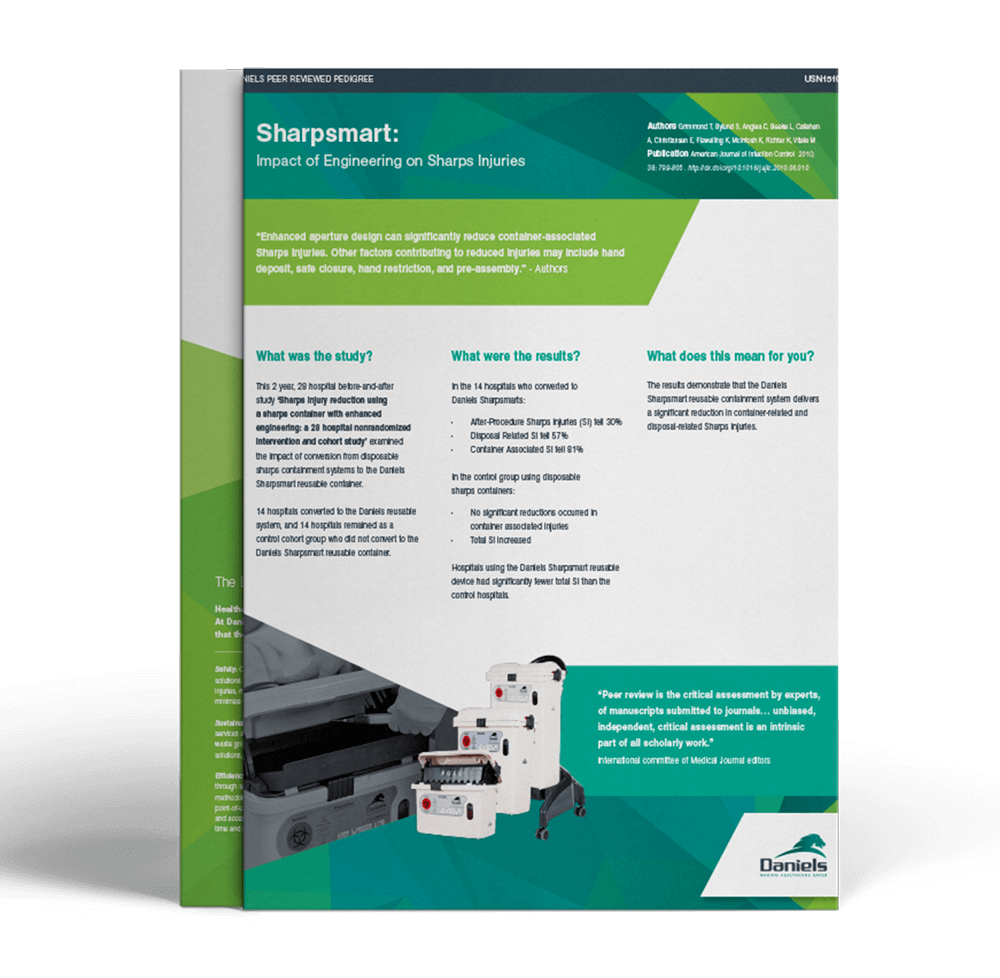 This peer reviewed study published in the Journal of Infection Prevention, documents a 6-year, 3-phase trial that examined the impact of converting from a small patient room sharps container to the Daniels Sharpsmart reusable sharps container. With results showing a dramatic reduction in sharps injuries, this short summary provides insights into the Sharpsmart’s unique value proposition.