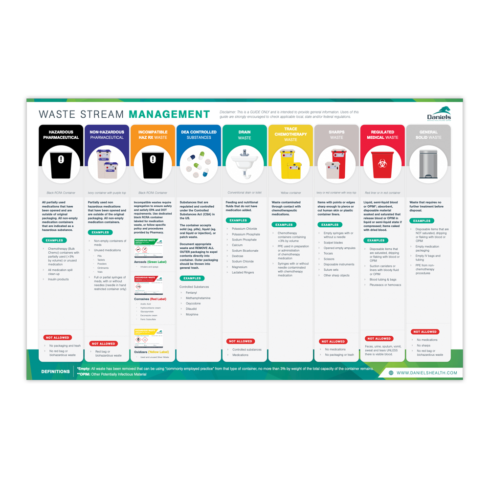 Effective Medical Waste Segregation is an essential step in minimizing environmental impact and optimizing costs in medical waste disposal. This educative healthcare waste matrix outlines correct containers and contents for disposal of all streams of medical waste; color coding helps for quick easy recognition of correct medical waste segregation in fast paced clinical environments.