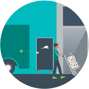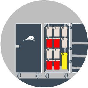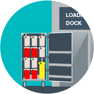 Once the container is full, a service tech scans the container barcode to identify its ward positioning for audit reporting and analysis, and engages the side-locks of the collector to prevent further access. The container is then moved to wall mounted storage within the ward’s utility room, or bulk-transported on an internal delivery cart to the hospital loading dock. At dock level, Daniels transporters optimize storage footprint significantly. The process of transferring container directly from a cart into a transporter ensures containers never touch the ground and remain uncontaminated ready for pickup.